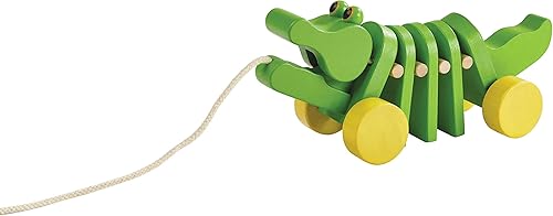 Made from chemical-free, sustainably sourced rubber trees and non-toxic, organic pigments and water-based dyes, the colorful alligator is a safe, enjoyable toy. It provides hours of entertainment to toddlers and preschoolers with a 24 inches long pull cord and a gentle click-clack sound when pulled.